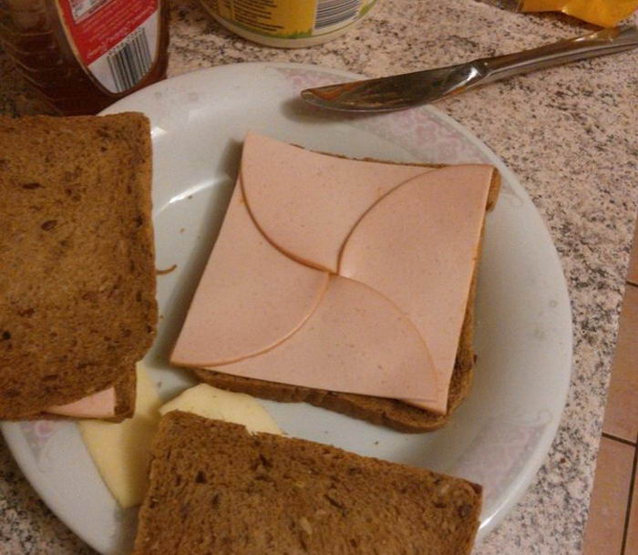 13. นี่คือวิธีการตัดแบ่งโบโลนา 2 ชิ้น แล้ววางลงในแซนวิชให้เป๊ะ
