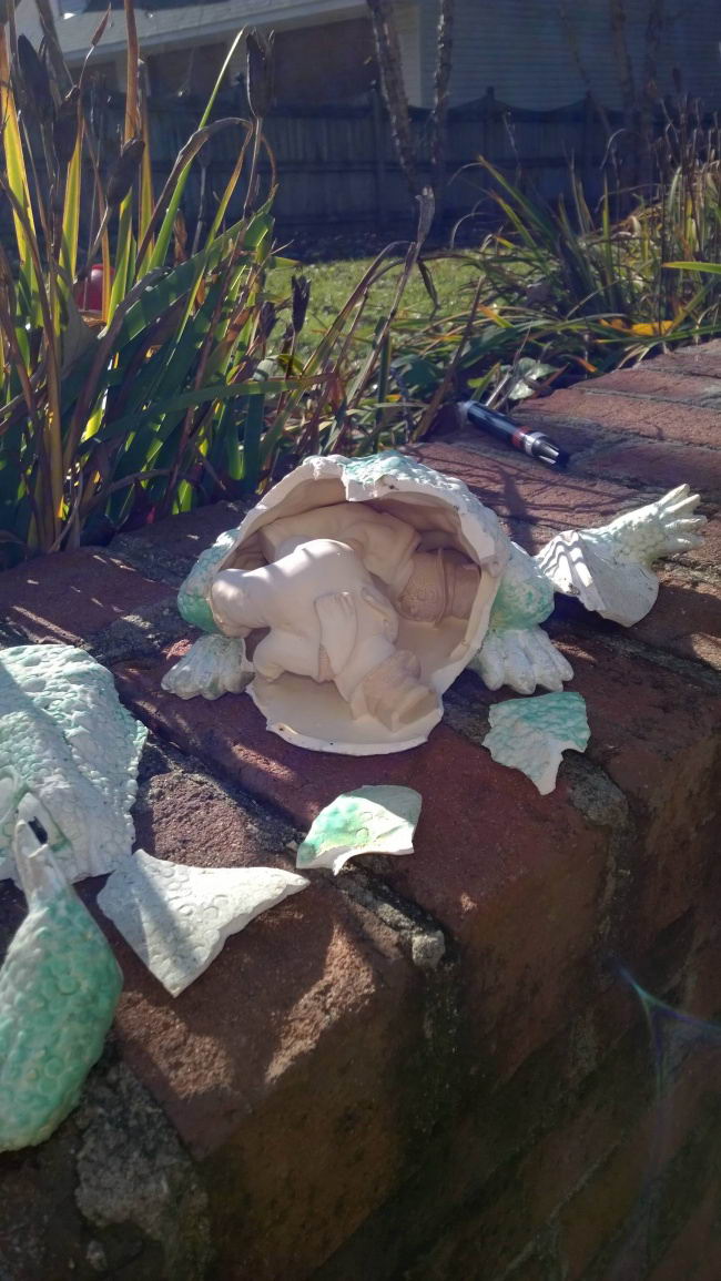 8. ทำกระถางรูปกบแตกออก และก็พบว่ามีตุ๊กตาหิมะปั้น 2 ตัวอยู่ข้างใน