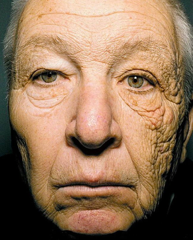 4. ความแตกต่างระหว่างใบหน้าด้านขวา กับใบหน้าด้านซ้ายที่โดดแดดเผาระหว่างขับรถบรรทุกมาตลอด 28 ปี